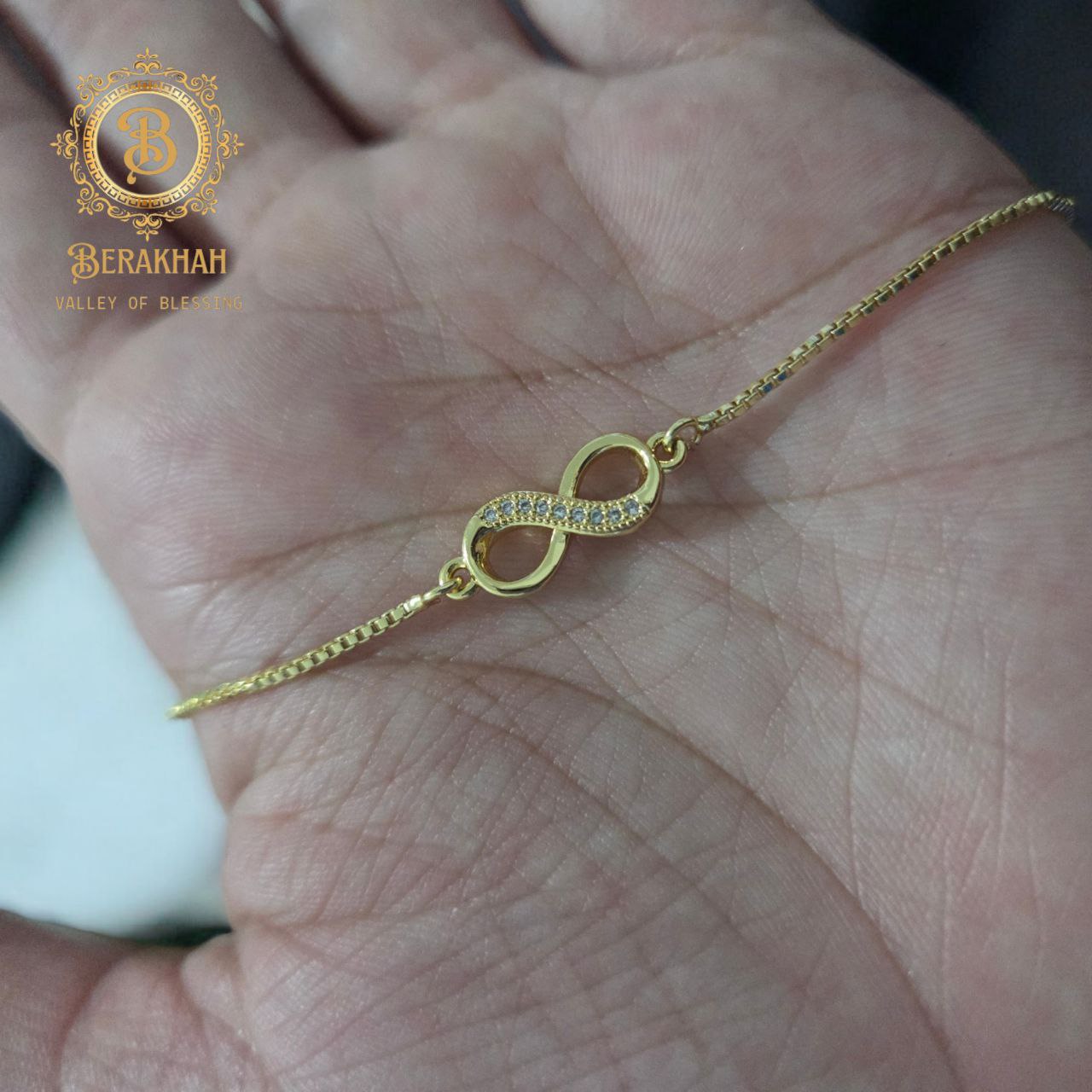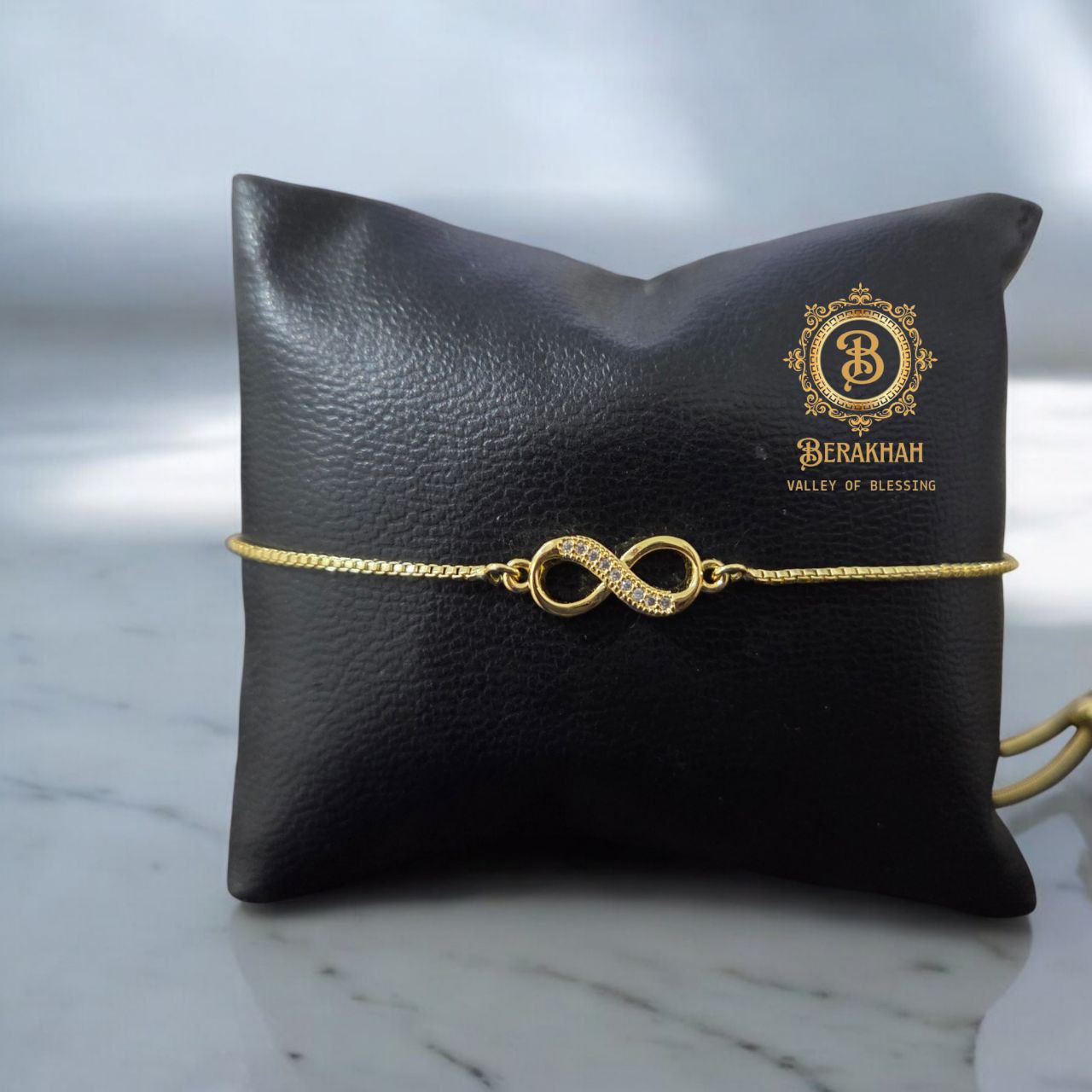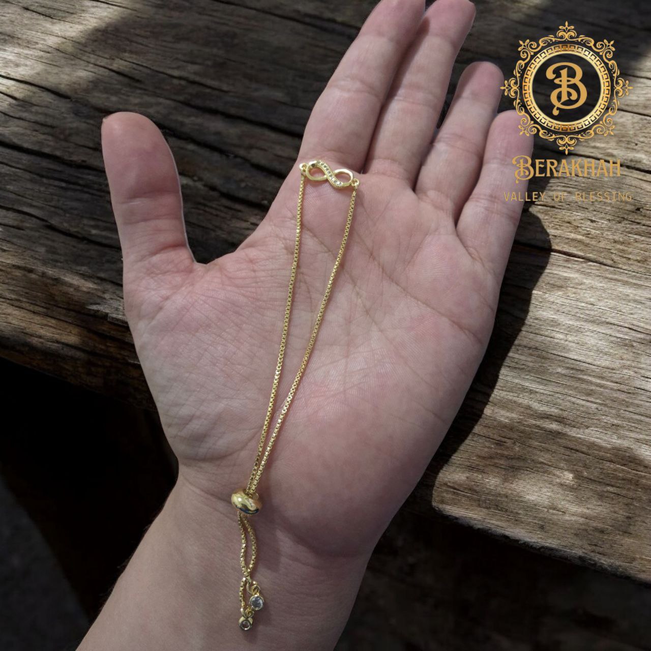 La Pulsera Infinito Divino, en tono dorado, lleva un símbolo del infinito inspirado en Apocalipsis 1:8: «Yo soy el Alfa y la Omega, principio y fin, dice el Señor, el que es y que era y que ha de venir, el Todopoderoso.»